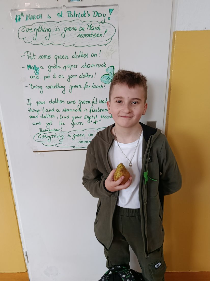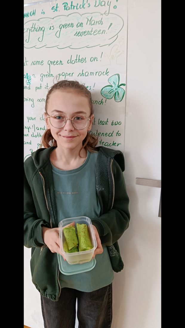 Takie hasło zachęcało dziś uczniów klas 4-7 do obchodów Dnia Św. Patryka. Nasza szkoła się dziś zazieleniła, i to nie z powodu nadchodzącej wiosny. Uczniowie, którzy dołączyli do zabawy mieli na sobie co najmniej dwa elementy stroju w kolorze zielony: papierową zieloną koniczynkę przypiętą do ubrania i zieloną przekąskę na drugie śniadanie. Zielone naleśniki Zosi wyglądały naprawdę smakowicie!