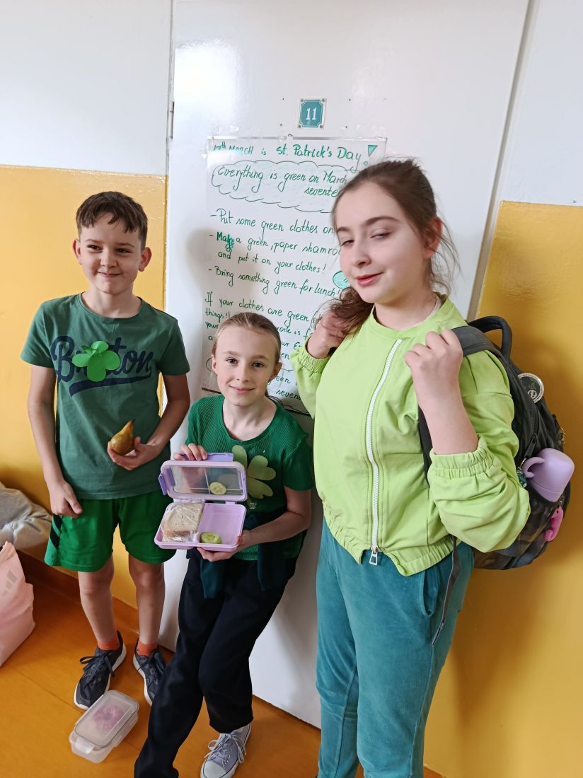Takie hasło zachęcało dziś uczniów klas 4-7 do obchodów Dnia Św. Patryka. Nasza szkoła się dziś zazieleniła, i to nie z powodu nadchodzącej wiosny. Uczniowie, którzy dołączyli do zabawy mieli na sobie co najmniej dwa elementy stroju w kolorze zielony: papierową zieloną koniczynkę przypiętą do ubrania i zieloną przekąskę na drugie śniadanie. Zielone naleśniki Zosi wyglądały naprawdę smakowicie!