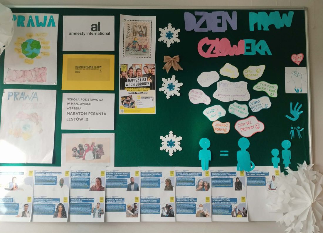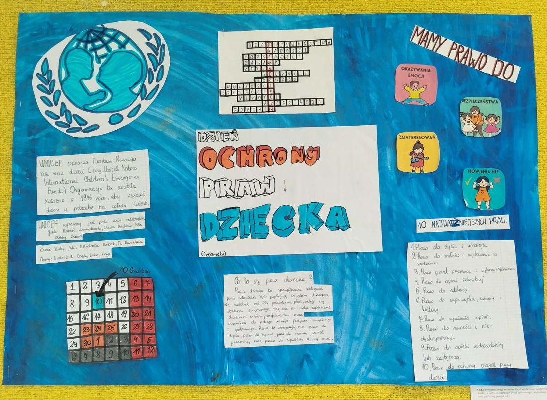 W związku z tym że 20 listopada obchodzilismy Światowy Dzień Ochrony Praw Dziecka, temat ten został wybrany do przedstawienia na gazetkach klasowych. Dodatkowo był kontynuacją tematu z poprzedniego miesiąca - Przeciwdziałania Przemocy Wobec Dzieci. Oba tematy są trudne i ważne. Wszystkie klasy stanęły na wysokości zadania i przygotowały ciekawe gazetki. Klasa 7 połączyła tematykę praw dziecka z prawami człowieka (Dzień Praw Człowieka, który obchodziliśmy 10 grudnia) i akcją Maratonu Pisania Listów Amnesty International (w akcji tej nasza szkoła bierze udział nieprzerwanie od kilkunastu lat).
