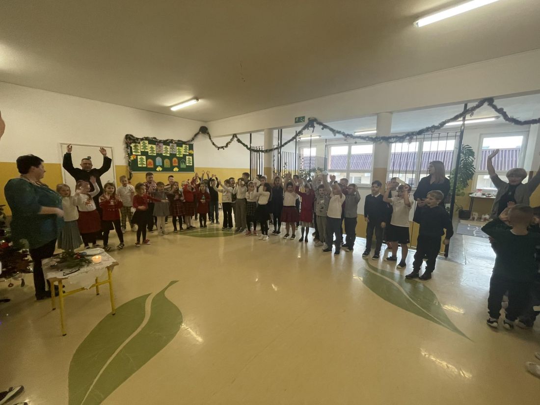 W tym uroczystym dniu przedszkolaki i uczniowie naszej szkoły w odświętnych strojach dzielili się opłatkiem, śpiewali kolędy i składali sobie życzenia. Wszyscy już czują atmosferę zbliżających się Świąt Bożego Narodzenia.
