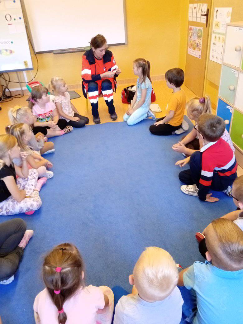 Dnia 3 października w związku z realizacją tematów związanych z bezpieczeństwem, dzieci z grupy 0a uczestniczyły w spotkaniu z pielęgniarką szkolną. Dzieci uważnie słuchały pani pielęgniarki, która z ogromnym zaangażowaniem prezentowała wyposażenie apteczki i akcesoria potrzebne do udzielania pierwszej pomocy. Pani pielęgniarka przypomniała dzieciom, jak należy wezwać pomoc przez telefon i rozmawiać z dyspozytorem pogotowia. Opowiedziała, w jaki sposób udziela się pierwszej pomocy zanim przyjedzie pogotowanie ratunkowe. Zademonstrowała również, jak należy prawidłowo ułożyć osobę w pozycji bezpiecznej oraz jak udzielić pierwszej pomocy w razie skaleczeń i upadku.