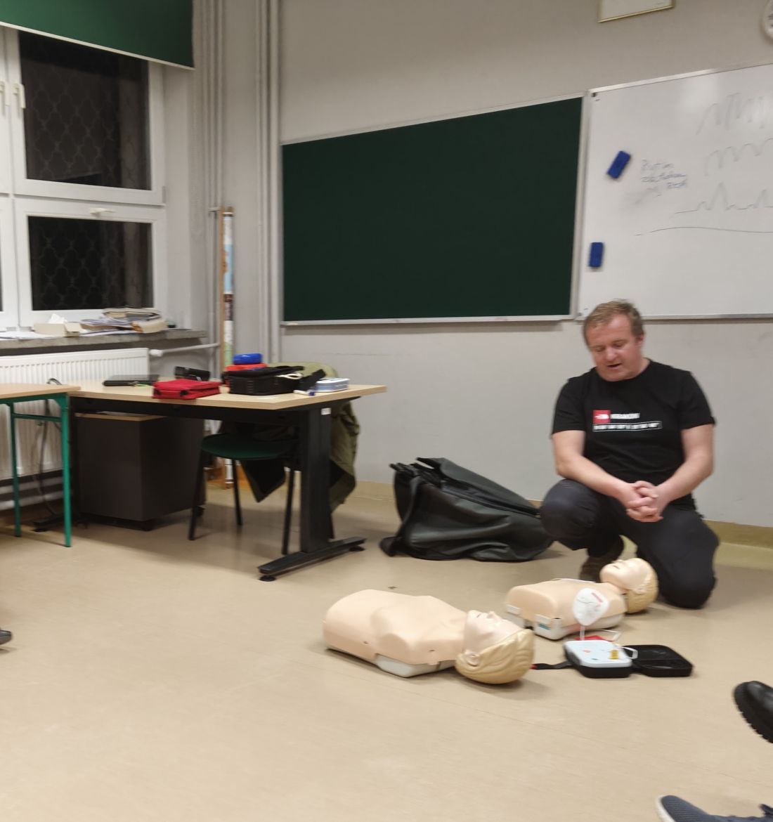 Szkolenie było skierowane do pracowników szkoły oraz osób zainteresowanych, obecne były osoby na co dzień pracujące w gminnej hali sportowej i gminnej bibliotece publicznej z filią w Maniowach. Wszyscy poszerzyliśmy swoją wiedzę i umiejętności w zakresie udzielania pierwszej pomocy przedmedycznej. Zajęcia miały charakter teoretyczno-praktyczny i obejmowały m.in. zasady rozpoznawania nagłego zatrzymania krążenia, prawidłowe prowadzenie RKO oraz bezpieczne i skuteczne użycie urządzenia AED.